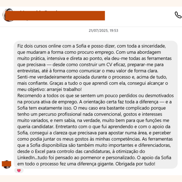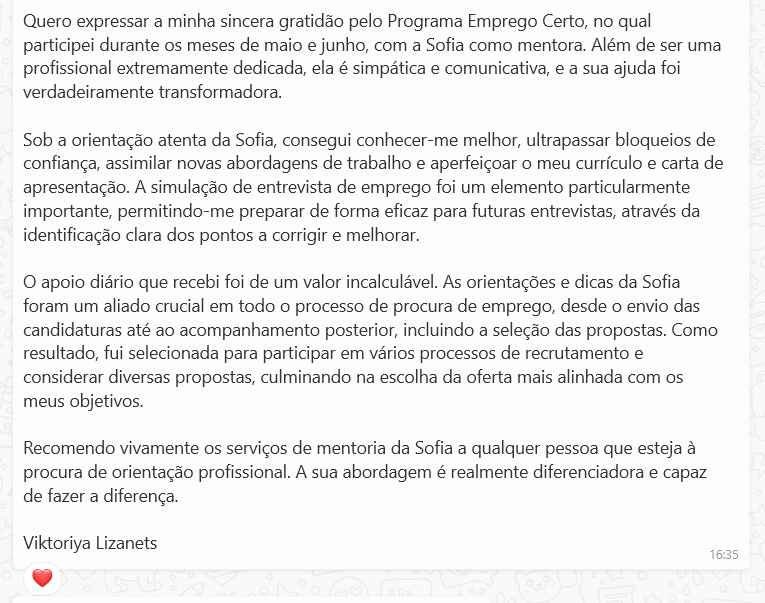 "Recomendo a qualquer pessoa que queira impulsionar a sua carreira com apoio profissional e personalizado da Sofia."