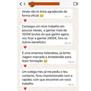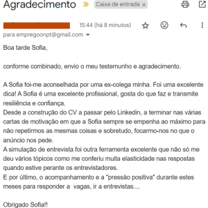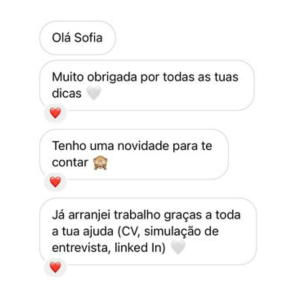 “Já arranjei trabalho graças a toda a tua ajuda (CV, simulação de entrevista, linked In).”