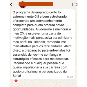 "Foi realmente um ótimo investimento, recorrer ao Programa Emprego Certo. Eu super recomendo os serviços da Sofia pra quem procura por uma oportunidade de mudança e sucesso!"