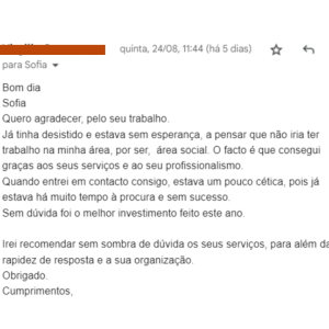 “(...) estava sem esperança, a pensar que não ia ter trabalho na minha área (...). O facto é que consegui graças aos seus serviços e ao seu profissionalismo. (...) Sem dúvida foi o melhor investimento...”