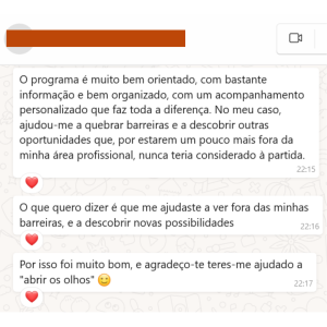 "(...) um acompanhamento personalizado que faz toda a diferença. Ajudou-me a quebrar barreiras e a descobrir outras oportunidades (...) que nunca teria considerado à partida."